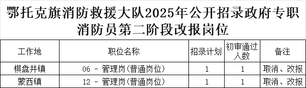根据《鄂托克旗消防救援大队2025年公开招录政府专职消防员公告》规定,第二阶段报名审核结束后,人数未达到开考比例的岗位将取消开考。被取消开考岗位的人员,可在2025年11月3日16:00至17:00改报其他岗位或放弃报名,目前无减少招聘人数岗位。